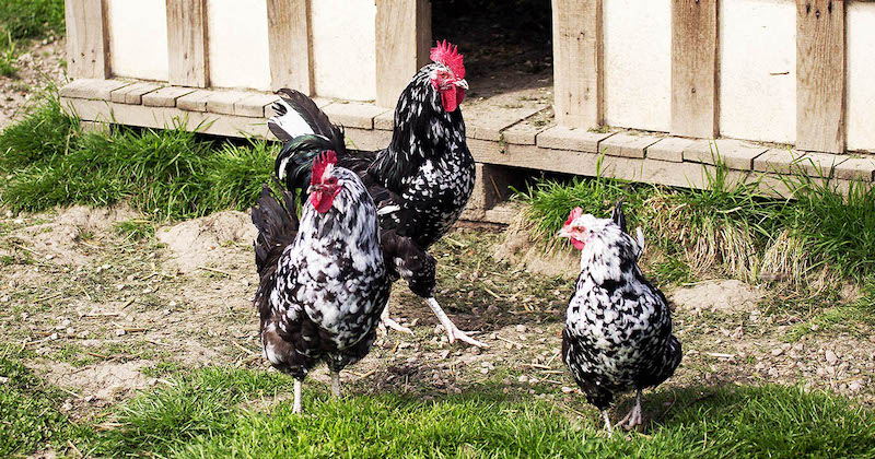 Cette race de poule avec photo possède un plumage de couleur noir et gris/blanc.